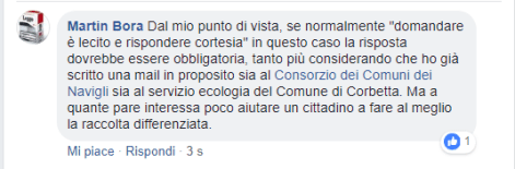 Sperando che il Consorzio dei Navigli sia più pronto negli interventi di quanto lo sia a rispondere ad un cittadino che chiede informazioni per fare al meglio la raccolta differenziata.