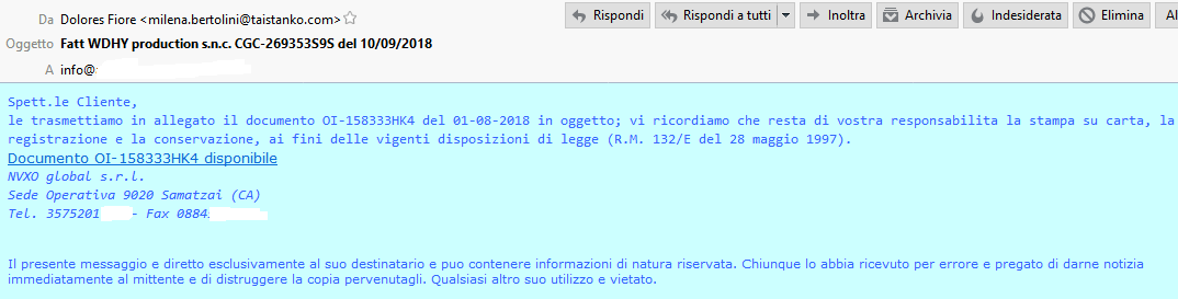 3 – Il dominio dell’email è taistanko.com, la fattura in oggetto è della WDHY production s.n.c. (che non esiste) ed infine in calce alla mail è citata la NVXO global s.r.l. (che non esiste)