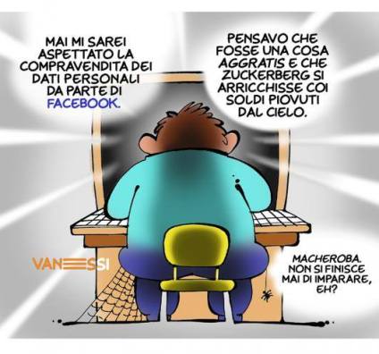 Sulla distanza FB è diventato più fastidioso che utile con un’invadenza veramente molesta; posso capire che mi offri uno spazio totalmente gratuito, anche se sappiamo bene che noi non siamo gli utenti, ma il prodotto, tuttavia all’ovvia mercificazione dei nostri dati ben spiegata in questa vignetta di Pietro Vanessi…