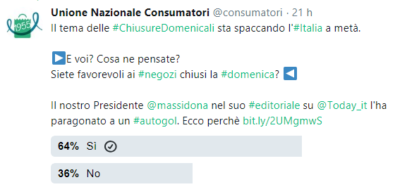 Su Twitter ho visto il sondaggio dell’Unione Naz. Consumatori circa la chiusura domenicale dei negozi.