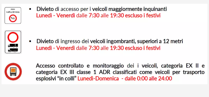 Divieto di ingresso per i veicoli maggiormente inquinanti: dal lunedì al venerdì dalle 7:30 alle 19:30 (escluso i festivi).