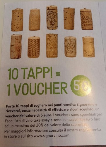 Ed infatti ieri abbiamo portato 30 tappi e ricevuto 3 buoni da 5 €, utilizzabili per l’acquisto di vino che non sia in promozione; ne abbiamo sfruttato uno per acquistare due bittiglie che senno’ non avremmo comprato.