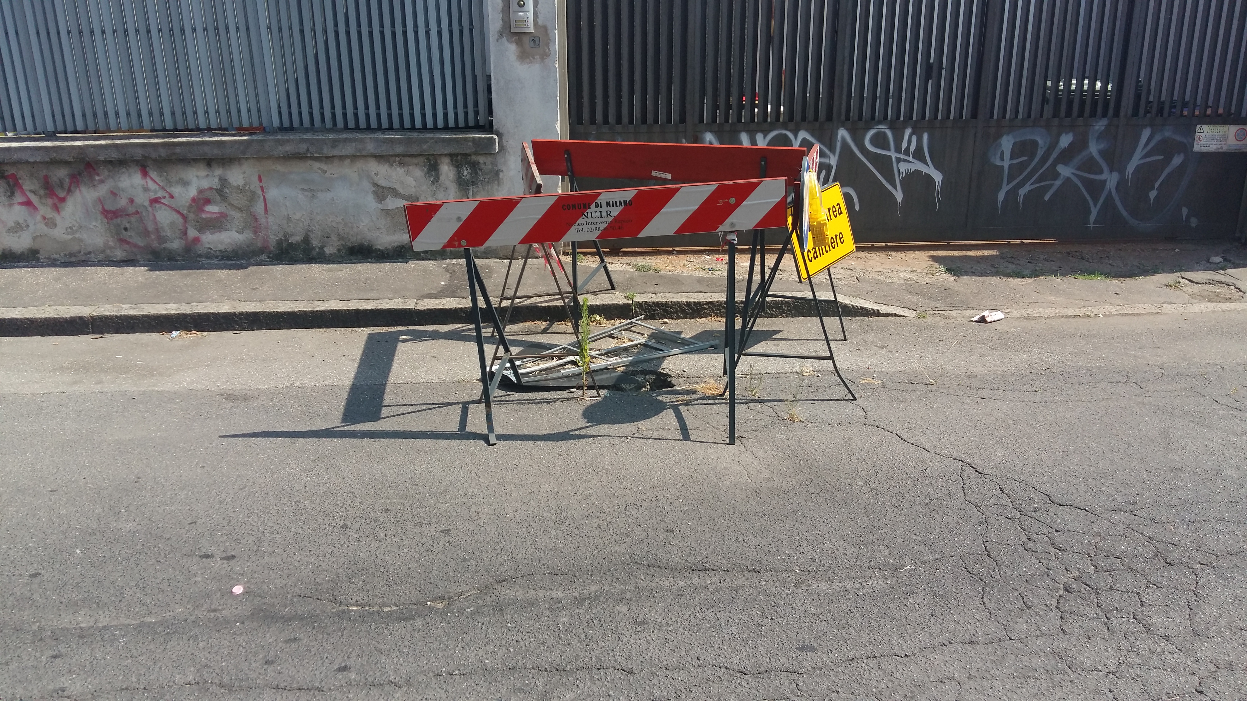 Nota a margine: è da parecchi mesi che un tombino ha ceduto ed anche in questo caso il Nuir è arrivato a piazzare i suoi cavalletti che però nel corso dei mesi hanno ceduto, prabilmente aiutati dai soliti idioti (vandali) …