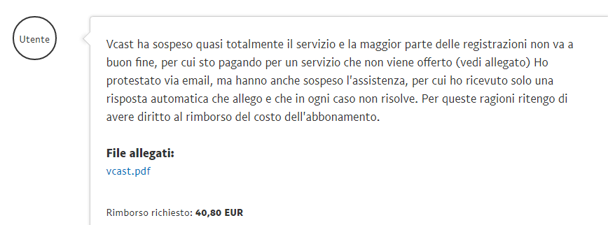 Sicuramente Vcast non darà corso alle mie proteste, per cui tenterò la via del reclamo anche se dubito che otterrò il rimborso, parziale o meno.