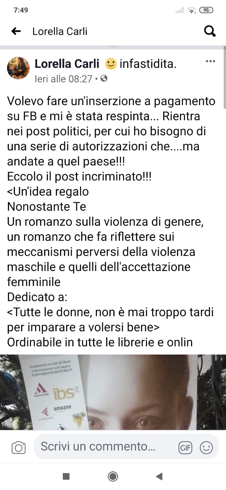 Ed un’amica che ha visto il video di Vanessi mi ha inviato la foto in calce accompagnata da queste parole: “E guarda l’approccio di Facebook sulla violenza di genere“.