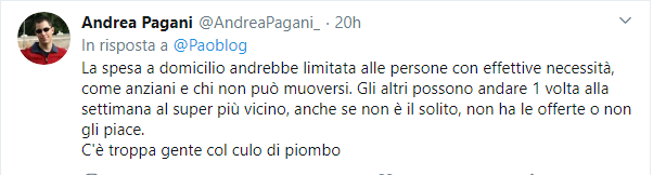 Al 9 marzo sono riuscito a convincere mia mamma (85enne) a fare la spesa online, come fatto peraltro in passato in occasione della sua frattura del polso o quando c’era stato un disguido nel rinnovo della patente a mio padre.