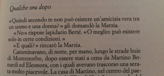 2. A furia di leggere le mie opinioni (tu chiamale recensioni, se ti va) in merito, l’amica @ro_0225 si e’ appassionata alle indagini del Comm. Berte’ di @michela_martignoni e mi ha detto che trova che abbiamo molto in comune (esclusa la “coda di cavallo”), ma questa volta ho trovato un “passaggio” che mostra una nostra differenza sostanziale tra il modo di pensare di Berte’ ed il mio ovvero l’amicizia fra uomini e donne. 🤔