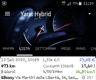 Sabato ho fatto il pieno e questo è il consumo reale riferito principalmente al tragitto casa-lavoro (62 km/giorno) percorsi al 30% in città ed il resto in un percorso extraurbano, ma con semafori, rotonde e talvolta in colonna.