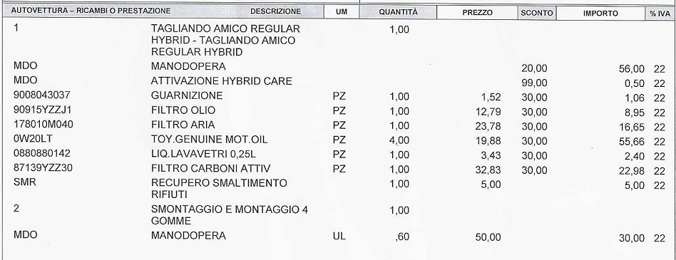 Per comodità ho abbinato il tagliando ed il montaggio delle gomme invernali; al solito usufruisco della promozione per le auto fuori garanzia e dell’attivazione della garanzia di 1 anno sulla batteria e sulle componenti ibride e meccaniche non soggette ad usura.