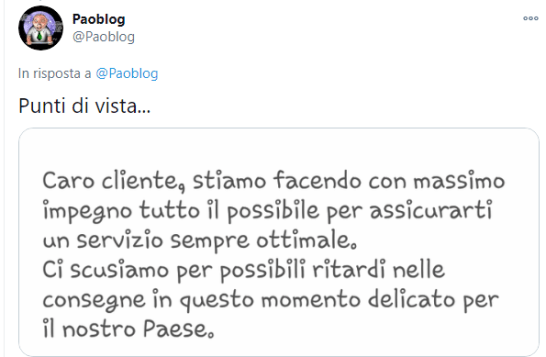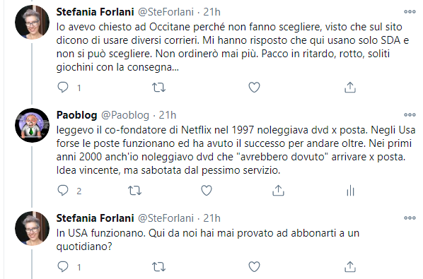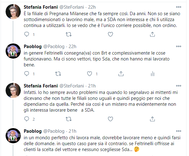 Da qui in poi pubblicherò uno scambio avvenuto via Twitter con Stefania Forlani, che mi segue su Twitter ed abita dalle mie parti e quindi vive le stesse problematiche, con SDA, ma non solo, perchè questi continui disservizi in consegna toccano in pratica tutti i vettori, il che dimostra una criticità dell’intero settore.
