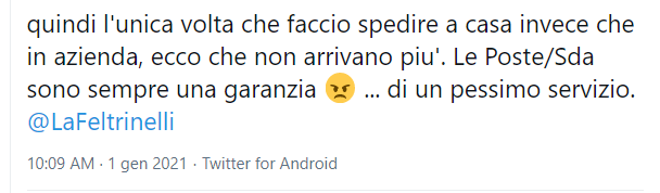 Capisco benissimo che la nevicata del 28 dicembre abbia complicato le cose, ma la decisione di Feltrinelli di affidare le consegne a SDA ovvero a PosteNews è autolesionismo puro, considerando i disservizi anche in giornate serene ed asciutte.