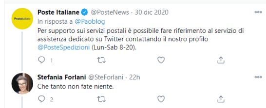 Poste Italiane, tirata in ballo su Twitter manda una risposta subito rispedita al mittente da Stefania
