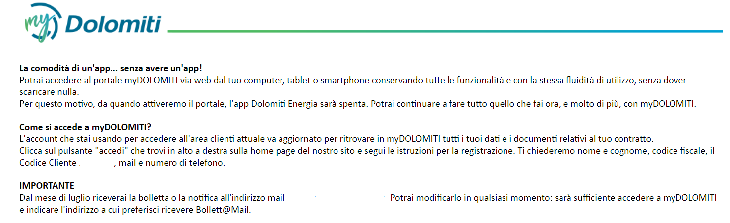 Oggi ho invece ricevuto un’email da Dolomiti Energia ovvero del fornitore di Luce & Gas a casa mia e come potrai leggere loro facilitano il cliente piuttosto che ostacolarlo, in pratica la stessa cosa che fa CoopVoce con la quale abbiamo tutte le Sim familiari ed anche quella aziendale, senza mai una sorpresa, un addebito non dovuto e la massima trasparenza.