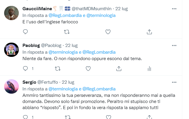 Ed infatti la risposta della Regione è arrivata, ma non rispondeva alla domanda di Licia Corbolante che quindi ha ribadito il punto: La mia domanda è diversa: perché un nome in pseudoinglese se le persone a cui è destinata l’iniziativa sono italofone?