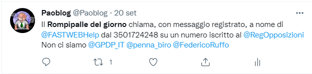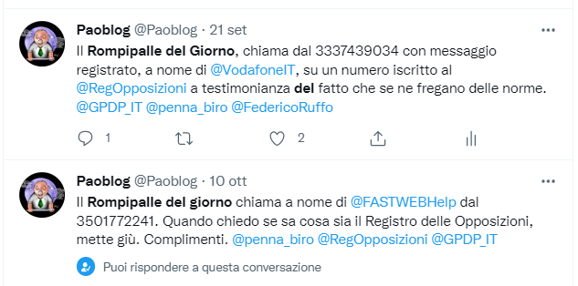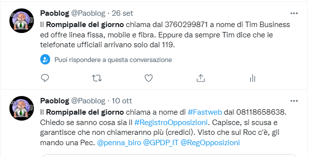 Quando ricevo una telefonata, faccio sempre un controllo del numero sul Roc e se lo trovo parte la Pec, poi verifico su Tellows ed infine pubblico su Twitter i numeri del cosiddetto Rompipalle del Giorno corredati da eventuali aggiornamenti; vedi ad esempio…