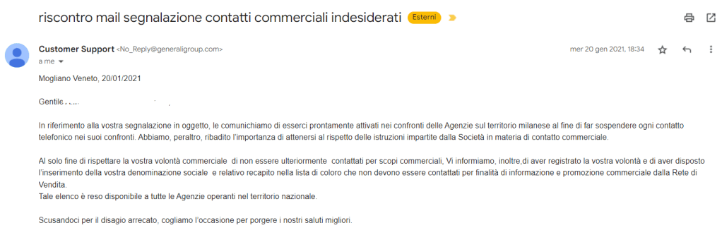 Notare che Generali, dopo una mia Pec, nel gennaio 2021 aveva confermato per iscritto la cancellazione del nominativo.