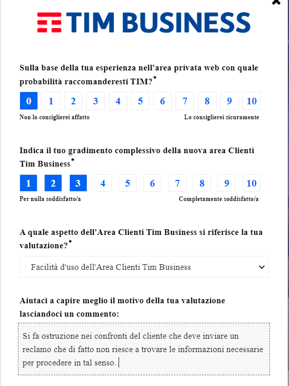 A differenza di Tim Business, che dopo un’email e 2 Pec (in copia ad Agcom) non si degna di rispondere, io sono educato e quindi dopo aver visitato la mia Area personale (aziendale) per vedere se il reclamo aveva avuto un riscontro, ho risposto al loro sondaggio.