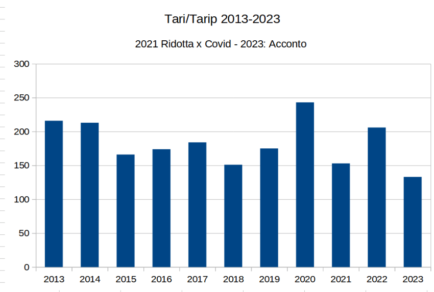 Qualche settimana fa è arrivato l’acconto della Tarip 2023, per cui ho perso 5 minuti a fare qualche statistica e questo è il grafico che riassume quanto abbiamo speso nel periodo 2013-2023.