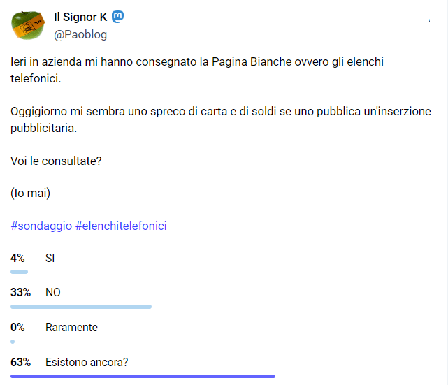 Ho quindi lanciato un sondaggio su Mastodon per vedere se il mio sentire era corretto o meno e la risposta, confermata anche dagli amici cui ho posto la stessa domanda, ha tolto ogni dubbio.