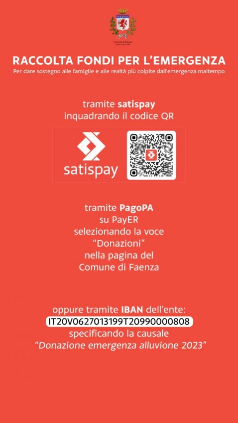SATISPAY: “Comune di Faenza Donazioni”, inquadrando il codice QR nell’immagine qui sotto.