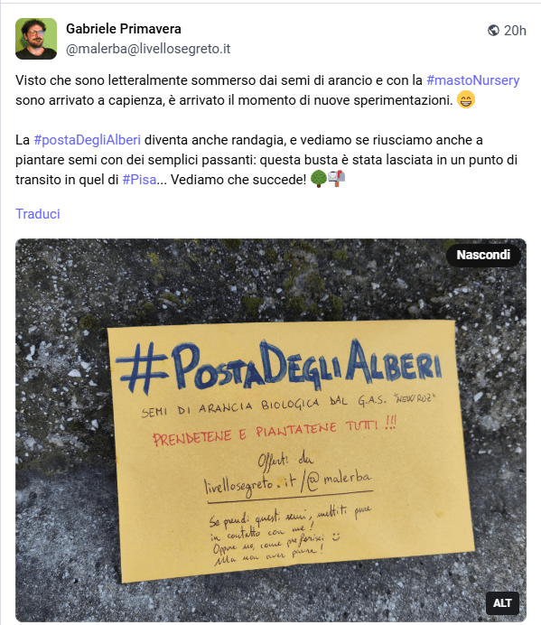 Su Mastodon è in corso da tempo un’iniziativa interessante portata avanti da Gabriele Primavera “per diffondere cultura degli alberi, da cui inevitabilmente dipendiamo, e aiutare a rimboschire il mondo, dalla città alla campagna.”