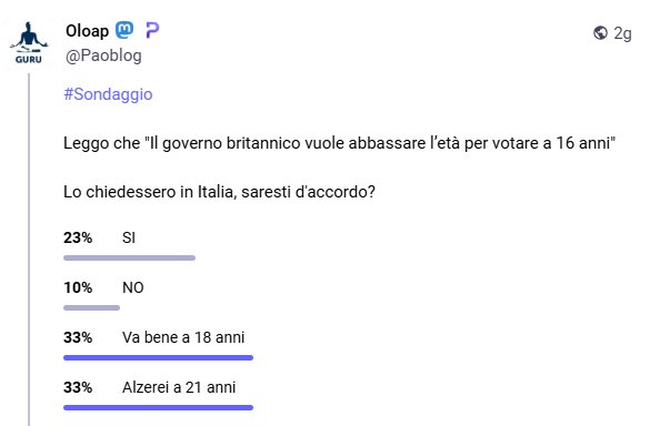 Giorni fa, dopo aver letto della proposta inglese di abbassare l’età di voto a 16 anni, ho lanciato su Mastodon un sondaggio in merito.