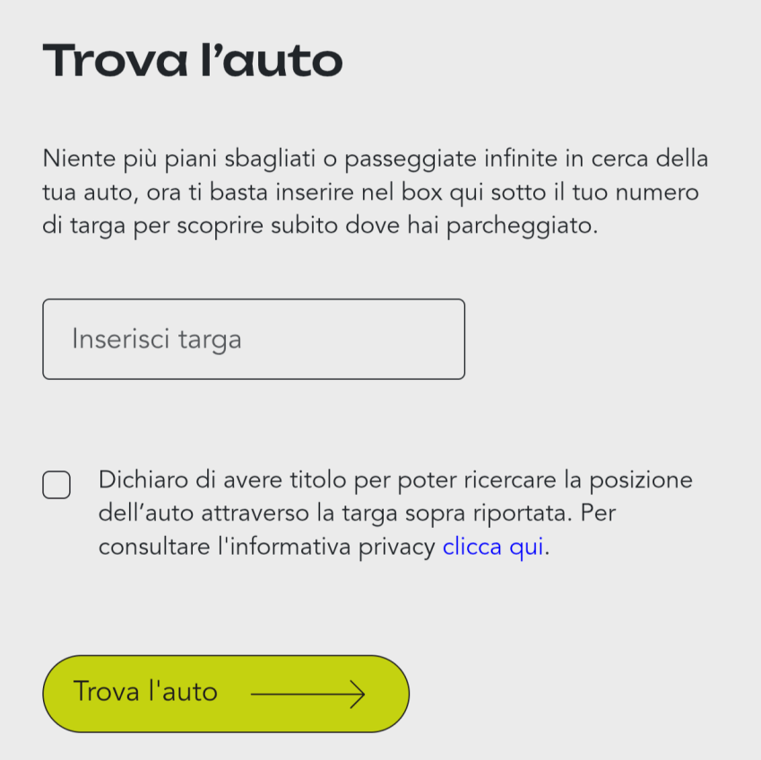 Stavo guardando il sito del Centro Merlata Bloom ed ho notato il servizio “Trova l’auto”, sicuramente comodo in un parcheggio immenso, tuttavia ho anche pensato al molestatore oppure all’ex geloso che ti segue ovunque e vuole prenderti di sorpresa…