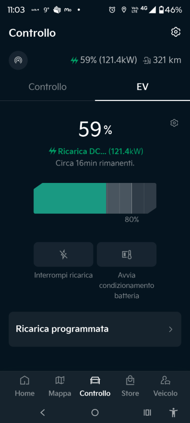 Ho quindi caricato con un picco massimo di 121,4 kW ovvero quasi il massimo visto che Kia EV3 GT Line carica fino a 128 kW.