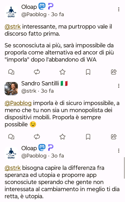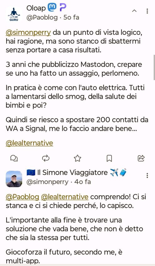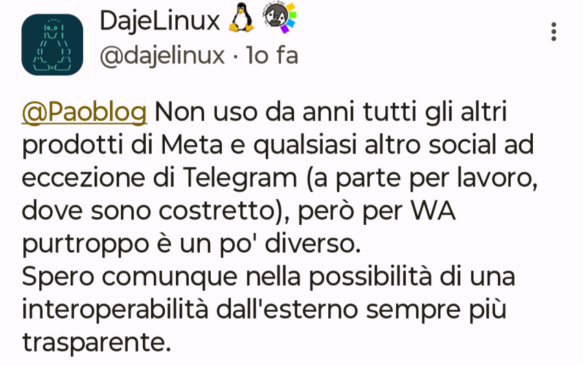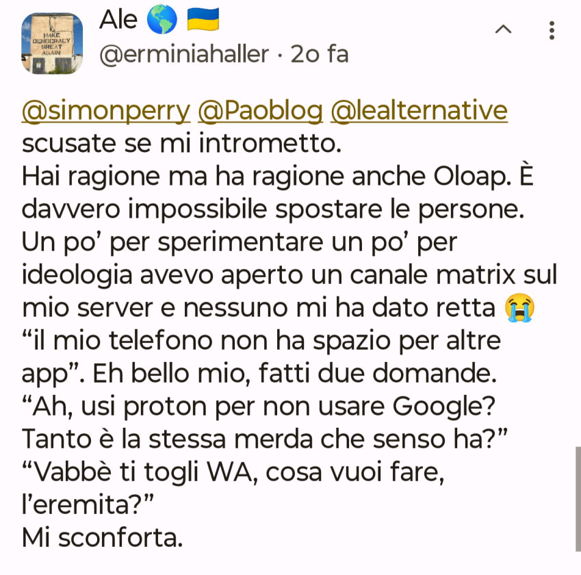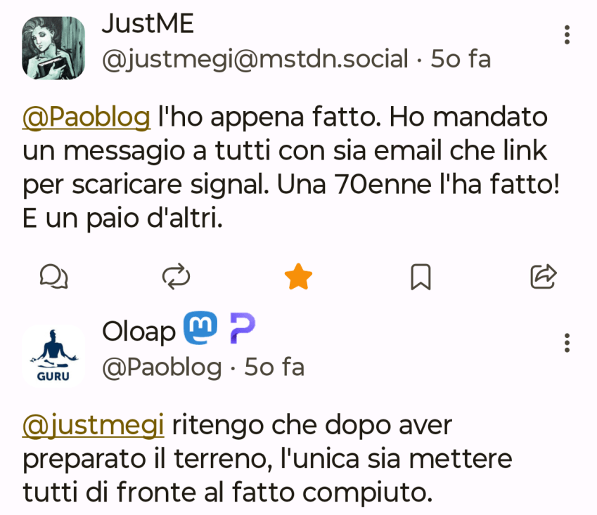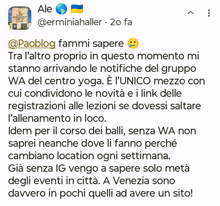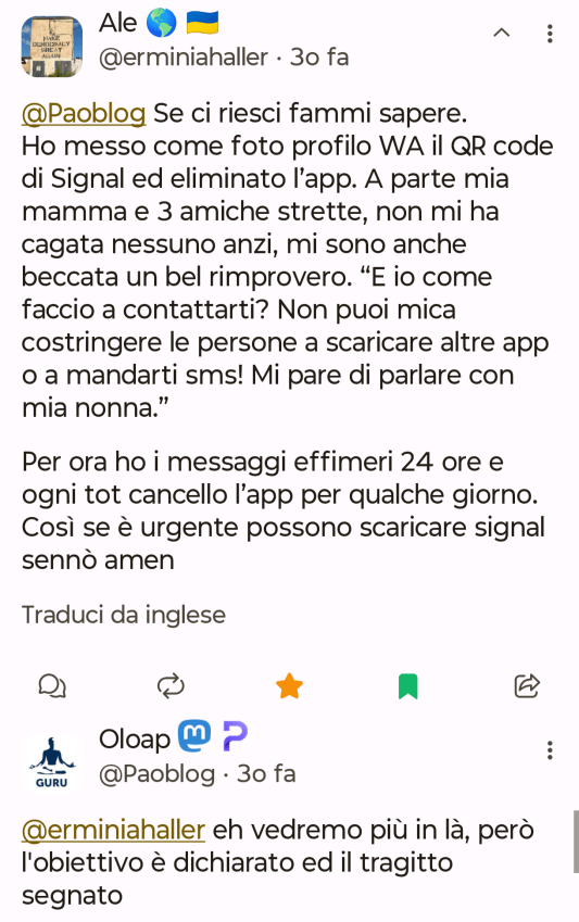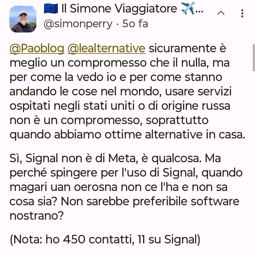 Non sono fra quelli che ad inizio anno fa liste con obiettivi da raggiungere o cosa da fare, tuttavia so per certo che nel 2026 voglio riuscire a mollare Whatsapp a favore di Signal dove peraltro ho già un Gruppo e contatti quotidiani con amicizie nate su Mastodon.