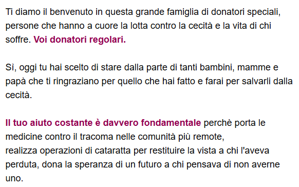 Adesso ho aggiunto anche Sightsavers perchè sono stato colpito dal racconto del decorso di una malattia, il Tracoma: se non si interviene in tempo, le ripetute infezioni creano cicatrici all’interno della palpebra. A questo punto le ciglia si rivoltano all’interno dell’occhio graffiandone la superficie. La malattia si sviluppa dove c’è mancanza di acqua, scarsa igiene e invasioni di mosche. Il dolore è così insopportabile che molte persone finiscono per strapparsi le ciglia pur di fermare l’agonia. Nel tempo, il tracoma può portare alla cecità.