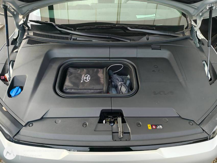 nel frunk ecco l’ottima trousse di pulizia di Toyota 😀che avevo sulla Yaris Cross e in aggiunta ho messo i cavi per la batteria 12V (facendo le corna) ed un paio di guanti e l’ombrello, entrambi offerti dalla Kia.