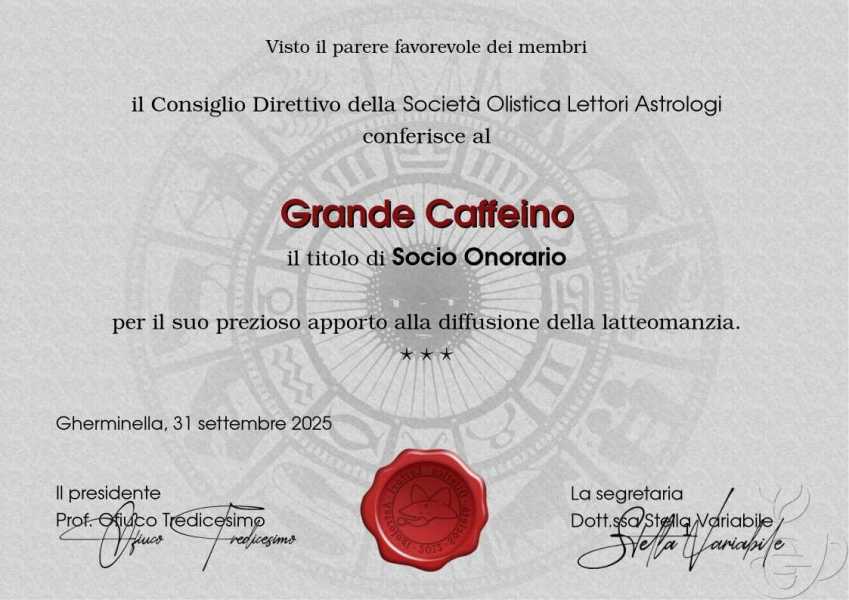 In un’affollata sala Van Goof, lo scorso 31 settembre 2025 l’insigne prof. Tredicesimo ha conferito al Grande Caffeino l’ambito titolo di Socio Onorario della S.O.L.A.