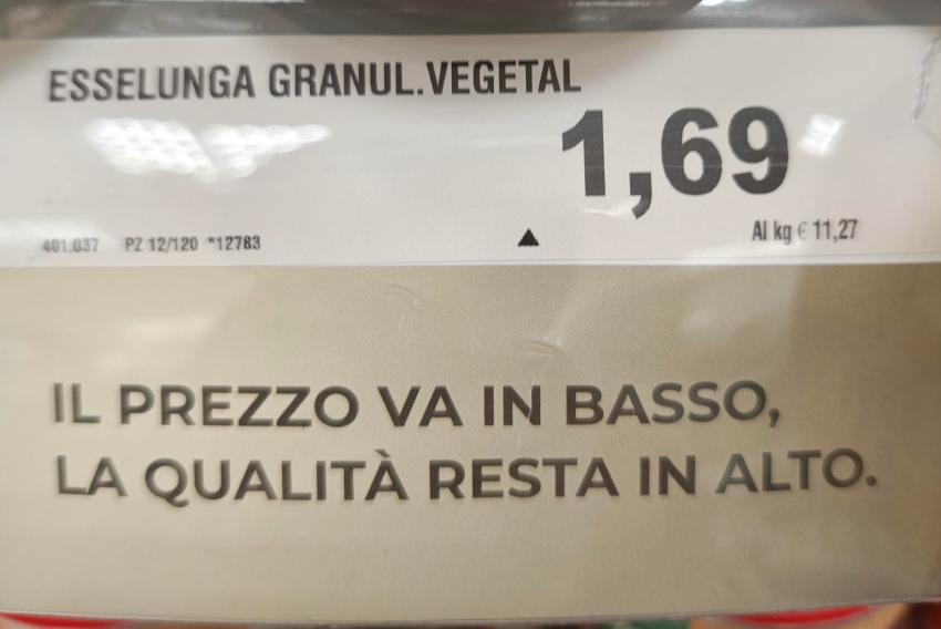 Sullo scaffale ecco l’etichetta del prezzo, sicuramente più basso di altri prodotti, ma trovo discutibile lo slogan che punta sull’aumento della qualità.