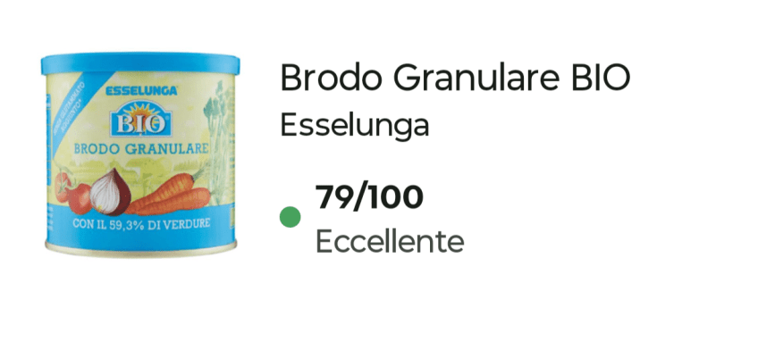Ho preferito acquistare il Brodo Granulare Bio, sempre di Esselunga, che come primo ingrediente ha le verdure (59,3%) ed un punteggio Yuka di 79/100 – Eccellente. Costa di più, 4,45 € contro 1,69 tuttavia non è un prodotto che si usa tutti i giorni e la dose è di 10 grammi, per cui va da sè.
