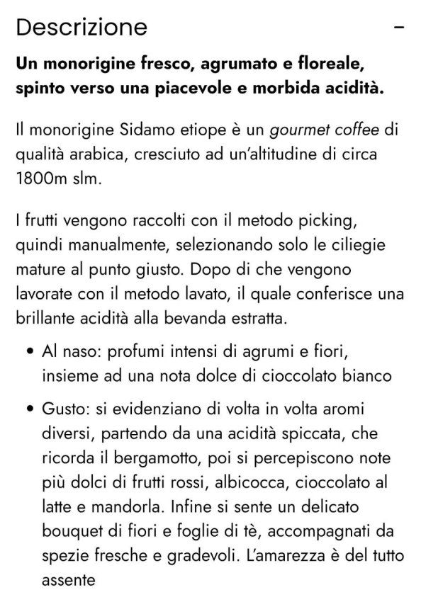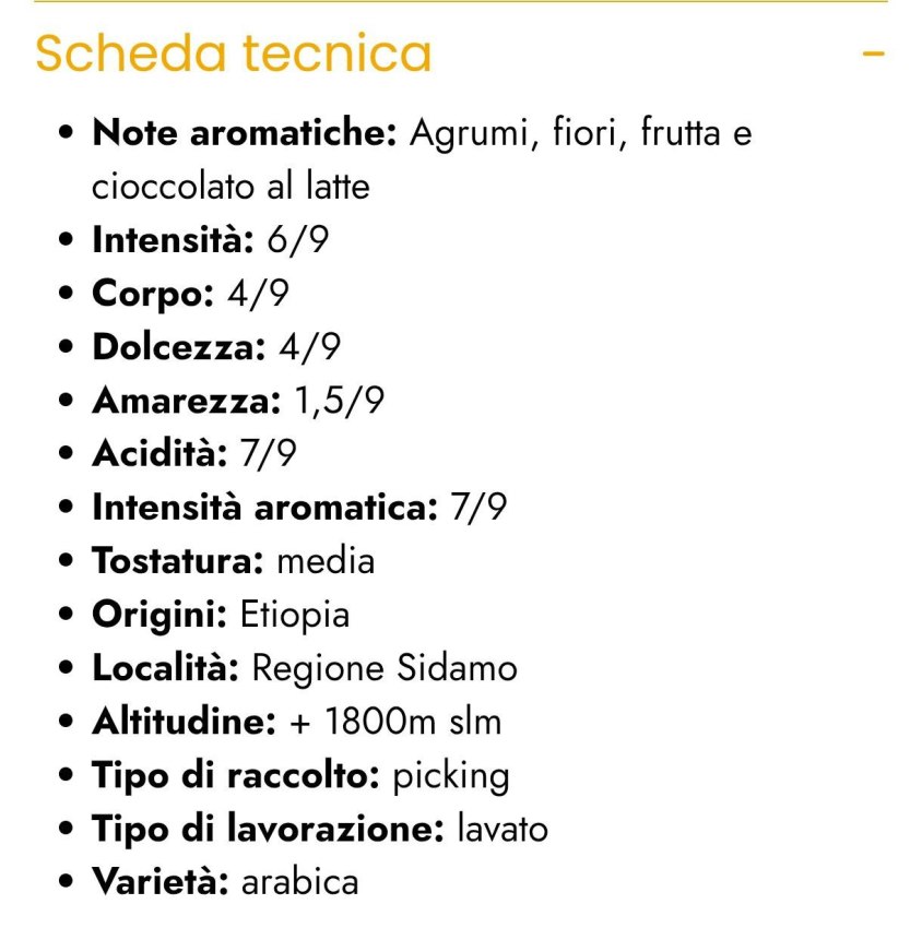 Terminata la confezione del monorigine Kenya AA Kirinyag ora tocca all’Etiopia Sidamo del quale di primo acchito percepisco l’assenza di amarezza ed un’acidità che al mio palato sembra inferiore a quello precedente, anche se secondo la scheda tecnica è equivalente a conferma del fatto che non ho la sensibilità di un assaggiatore professionista 😉